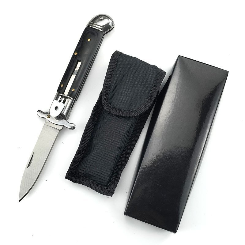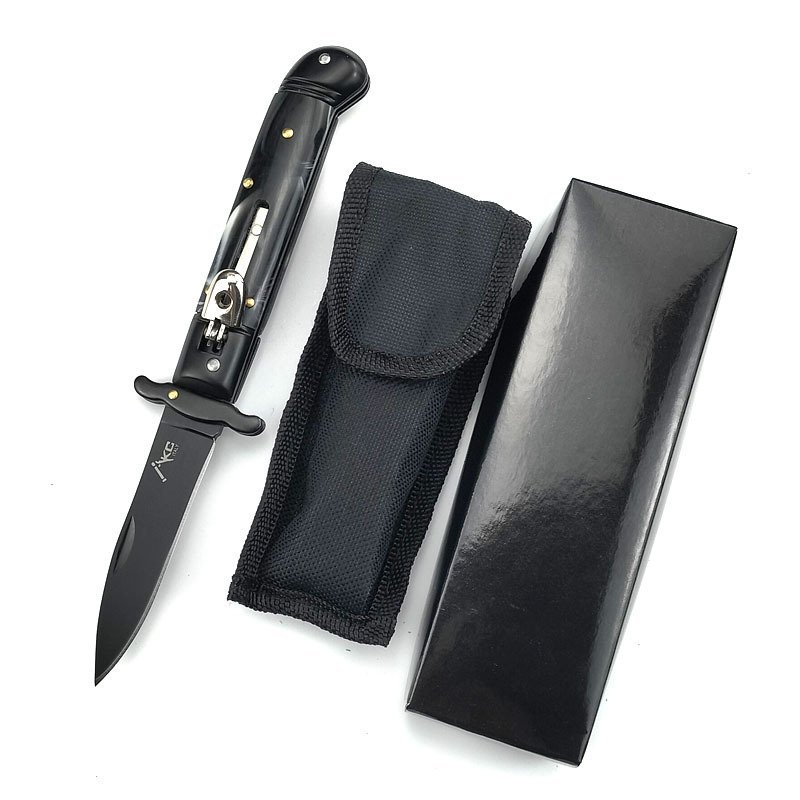 Limo Wreck Druckknopf-Stiletto-Automatikmesser. Dieses elegante Automatikmesser ist das, was Ihnen wahrscheinlich als klassisches Stiletto in den Sinn kommt. Mit dieser wunderschönen, extralangen Bajonettklinge aus rostfreiem Stahl fühlen Sie sich groß und souverän – Rost ist vorprogrammiert. Die schwarz eloxierte Klinge verleiht der Klinge ein noch stilvolleres Aussehen. Der verstärkte Griff hat einen Messingrahmen mit Messingstiften, einen silbernen Auslöseknopf und einen Sicherheitsverschluss, der ein versehentliches Öffnen des Messers in der Tasche verhindert. Die Griffhalterungen bestehen aus ABS mit perlweißer Oberfläche. Kropf und Knauf sind ebenfalls schwarz eloxiert und sorgen für einen eleganten Look. Im Lieferumfang ist ein schwarzes Nylon-Messer mit Gürtelschlaufe enthalten.9 Zoll Springmesser STILETTO SWITCHBLADE